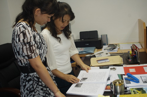 開(kāi)平市府方志辦譚月園主任(右)與工作人員對(duì)《生金記》進(jìn)行校編